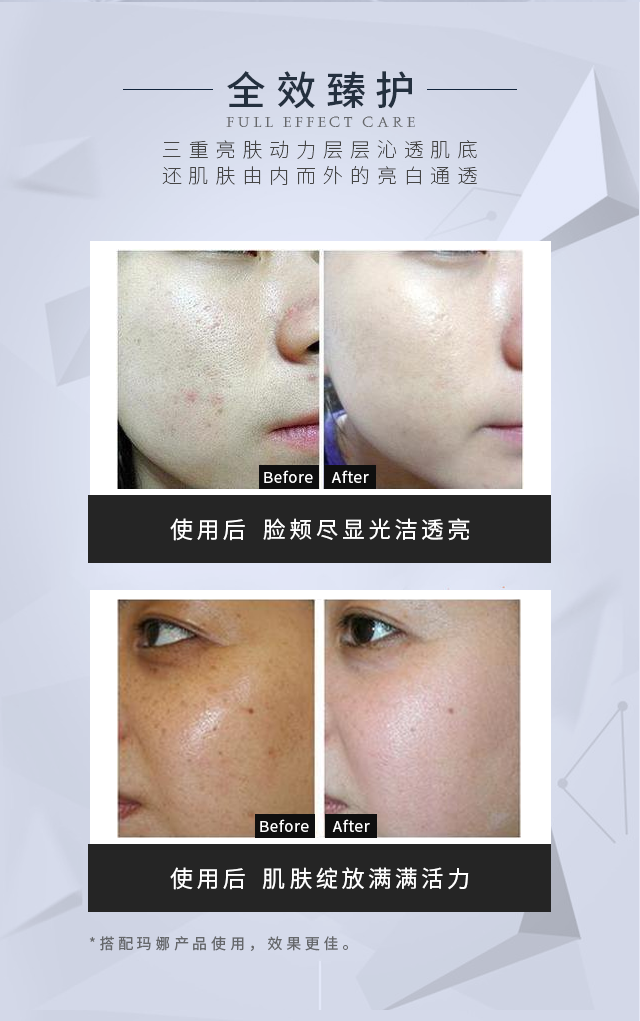 产品功:上乘天然植物萃取精华与多种保湿成分相结合,科学比配加乘亮肤焕颜,有改善因环境影响、吸收不畅等因素导致的肌肤干燥、粗糙、暗黄。Ⅰ型清爽水润质地,特含能与肌肤紧密贴合的活性肽类成分,予肌肤密集补水,深透提亮。Ⅱ型蕴含多种保湿成分,触感如琼浆般柔滑绵密,修护亮颜,焕醒肌肤后续吸收力。Ⅲ型富含珍贵植物提取精华,御颜臻养,缓解因外界环境对肌肤的影响,保湿锁水,使肌肤通透靓白。三重亮肤精华层层递进,使肌肤呈现水润亮皙,弹滑饱满的青春光彩。