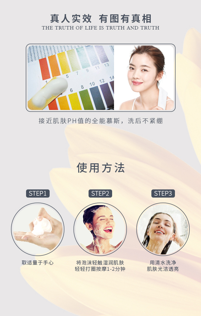 使用方法:取适量本品于手中,将泡沫轻触湿润肌肤,用指尖或手掌轻轻打圈按摩1-2分钟,再用清水洗净。