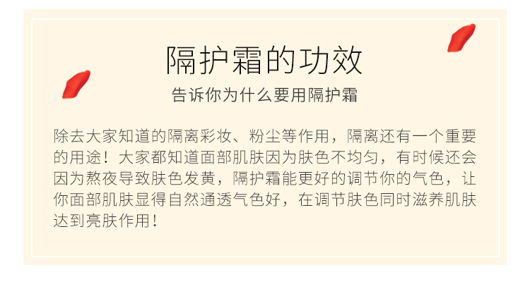 产品功效:隔离外界刺激,保湿与防护双重功,亲肤而不油腻,修饰肌肤瑕疵,清爽自然质地,缔造健康匀皙亮泽。