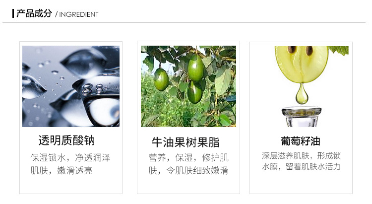 产品功效:丰富微量元素与营养成分,维持肌肤通透幼滑感,增加肌肤弹性度与紧实度,定格青春娇颜。