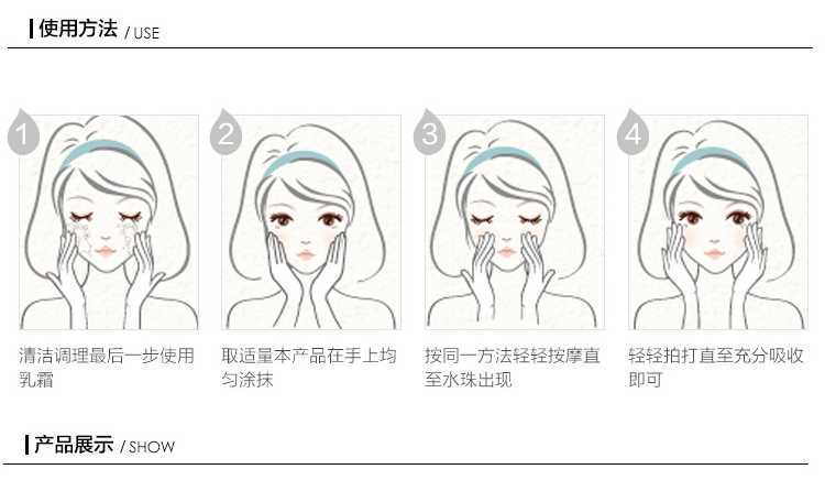 使用方法:洁肤后取适量本品 均匀涂抹于面部肌肤 轻轻按压至皮肤吸收。