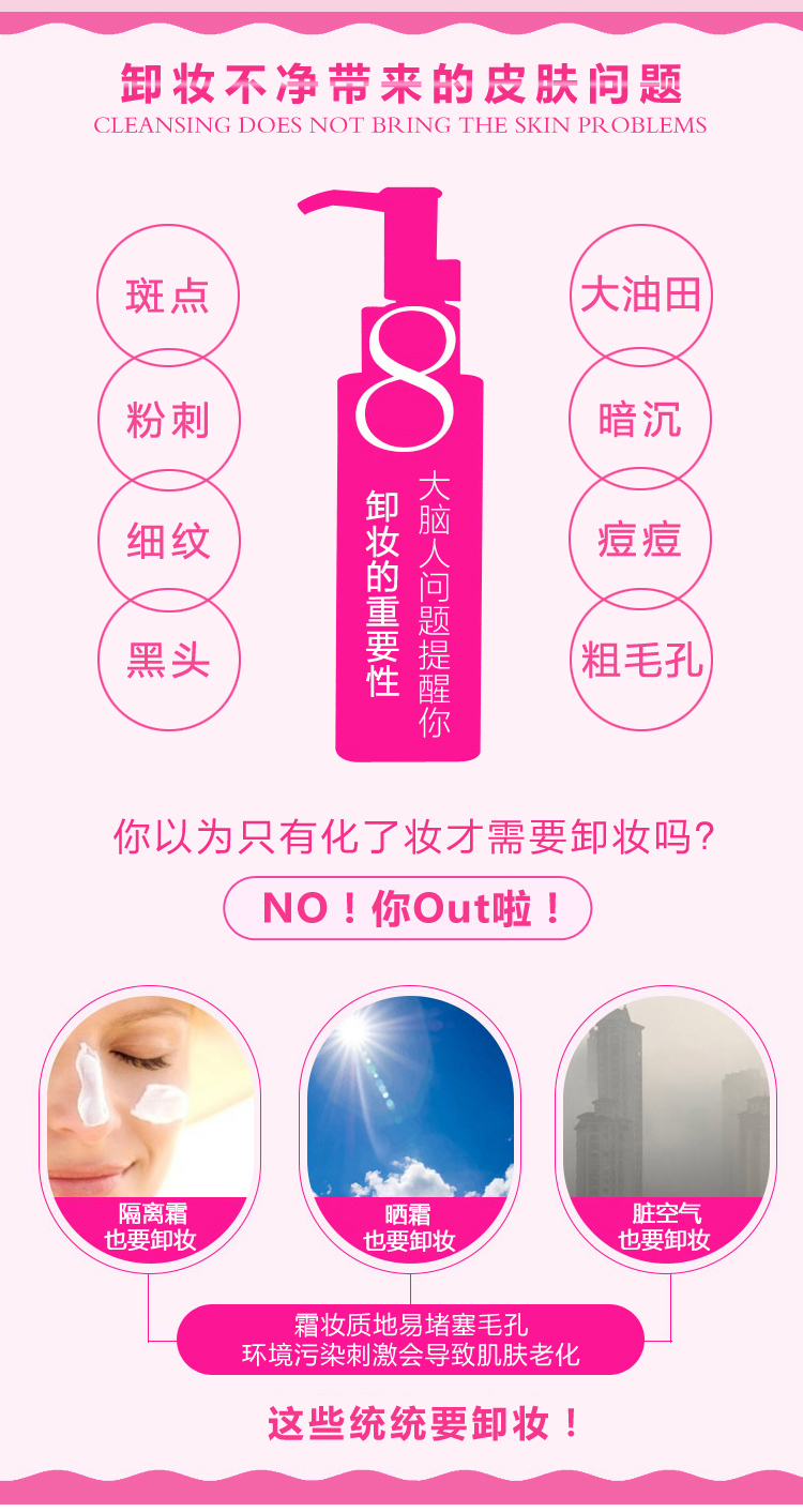 产品功效:亲水、温和、见水乳化,彻底卸除各种持久型彩妆及脸部毛孔污垢,同时保持肌肤滋润柔滑、细致水嫩。
