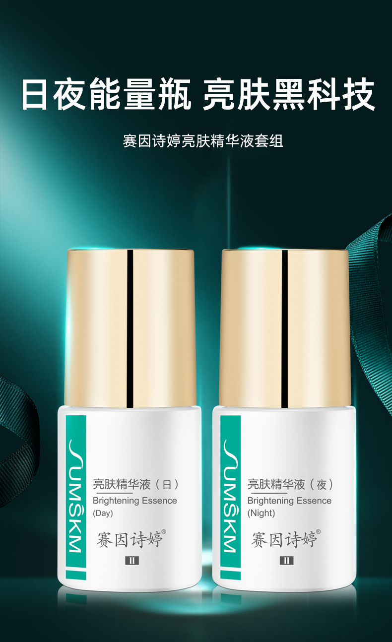 使用方法:洁肤后,取3-4滴敷于全脸,轻拍至吸收即可;白天使用亮肤精华液(日),晚上使用亮肤精华液(夜)。