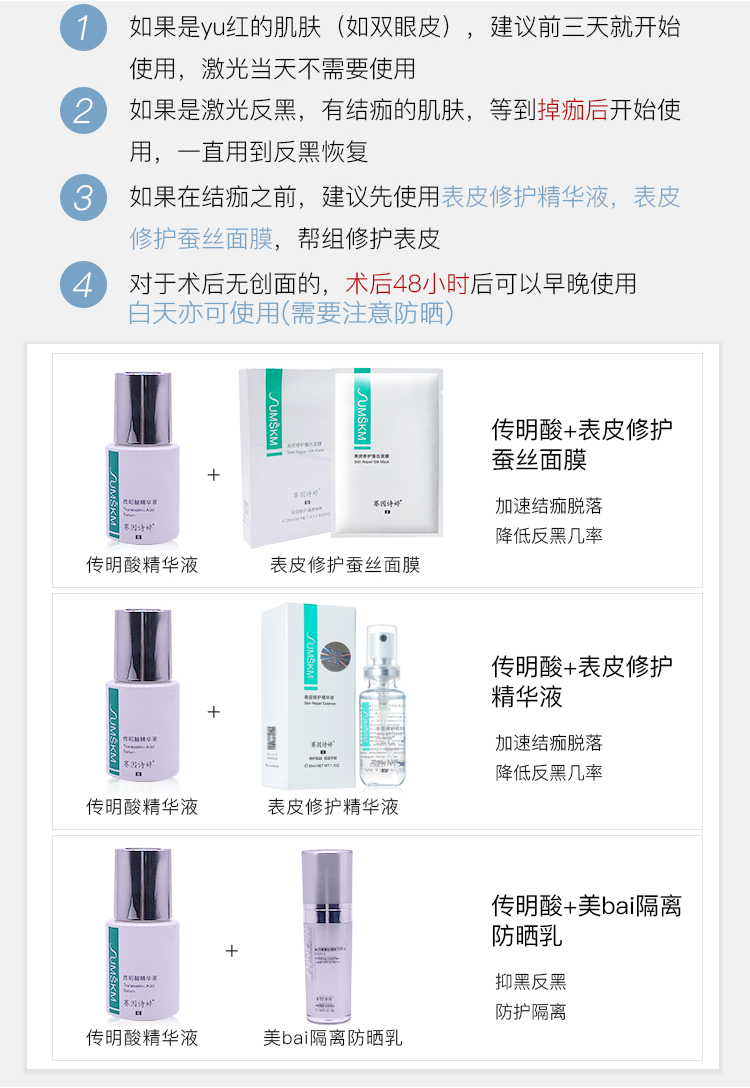 A:传明酸精华主要作用可以抑制酪氨酸酶活性,黑色素形成,提亮肤色,可当作日常长期的亮白护理使用,白天亦可使用(需要注意防晒)。