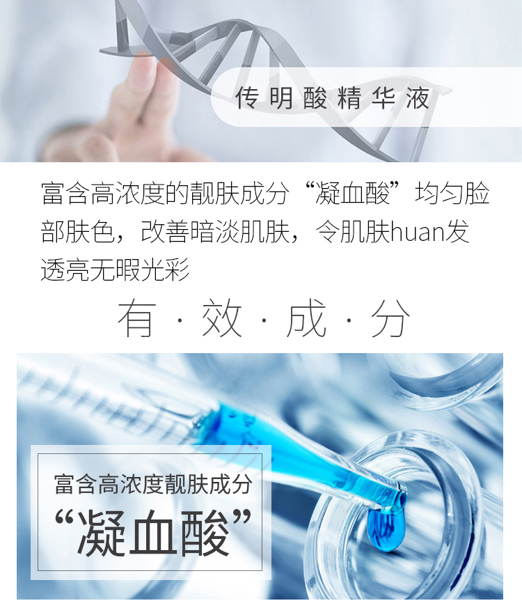 产品功效:富含高浓度的亮肤成分“凝血酸”,均匀脸部肤色,改善暗淡肌肤,令肌肤焕发透亮无暇光彩。