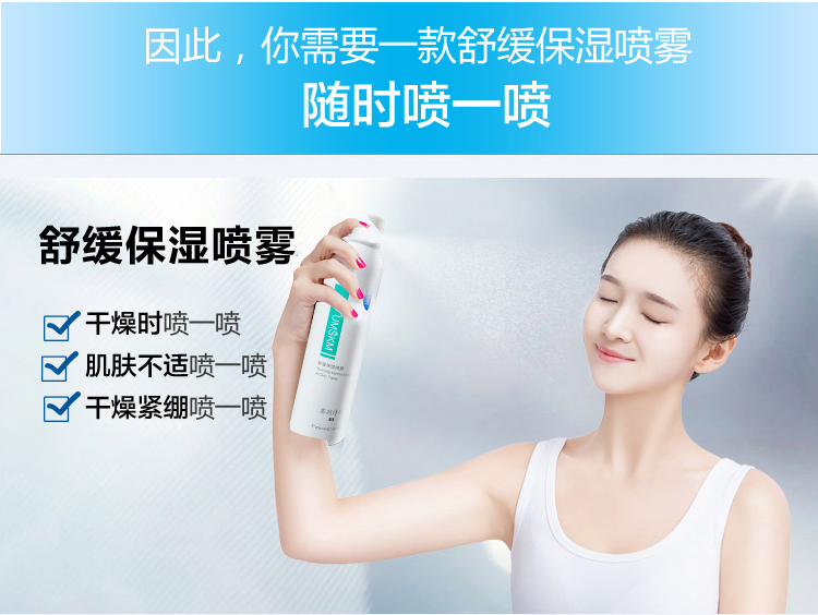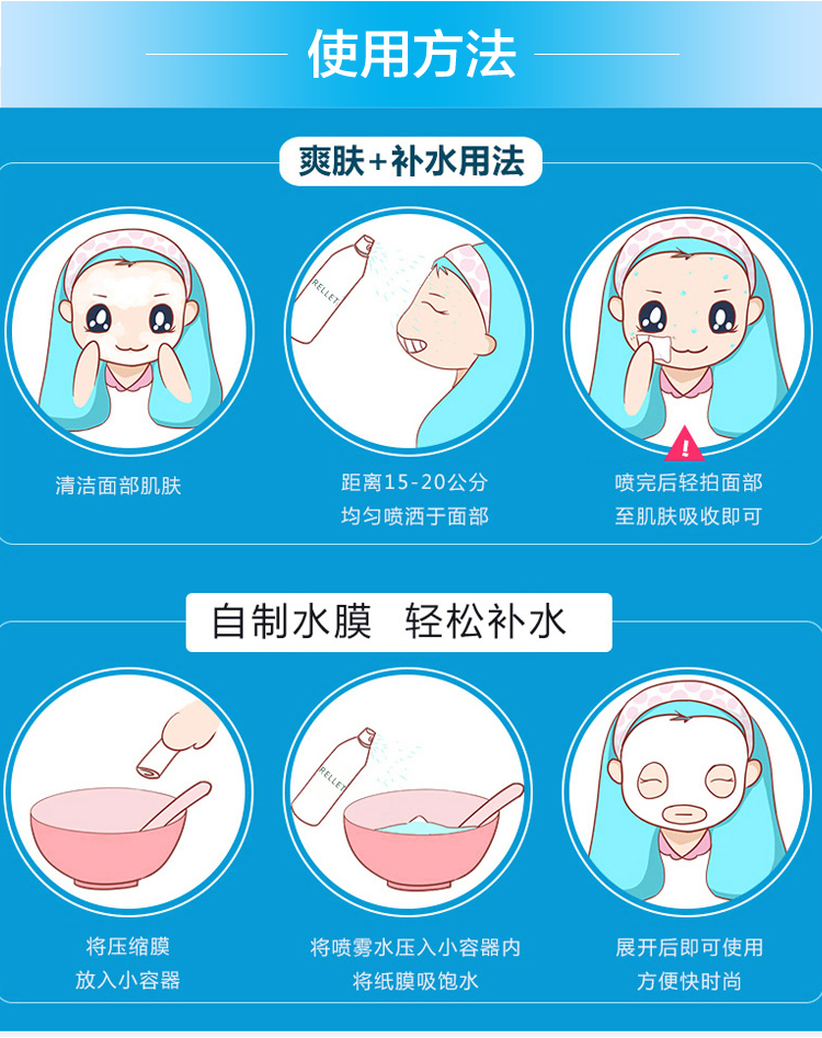 使用方法:距离皮肤15--20cm喷于面部肌肤,自然吸收