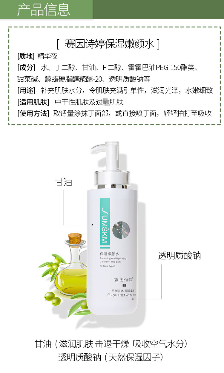 产品功效:补充肌肤水分,令肌肤充满弹性,滋润光泽,水嫩细致。