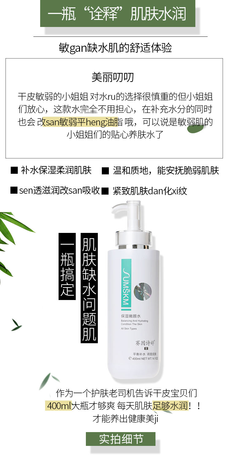 使用方法:取适量抹于面部,轻轻拍打至吸收。