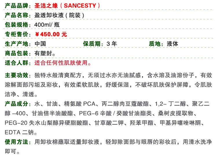 圣洁之缘 水分柔肤露400ml 保湿/光泽/柔嫩、改善干燥/缺水/脆弱敏.感肌肤