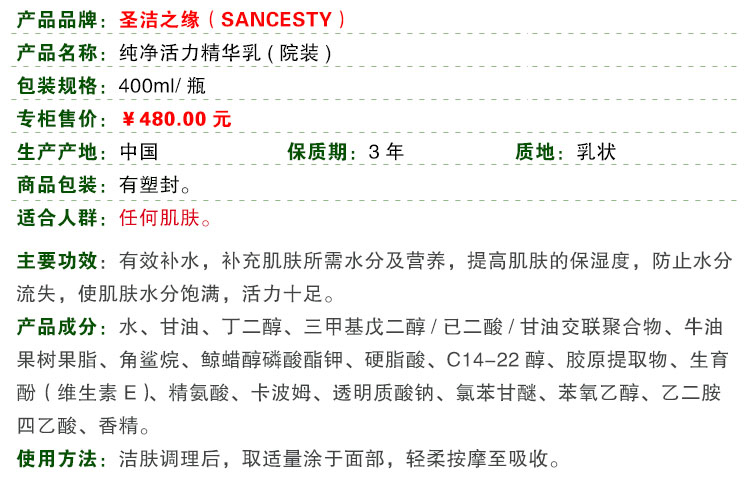 圣洁之缘 滢润水分精华乳400ml(纯净活力精华乳)