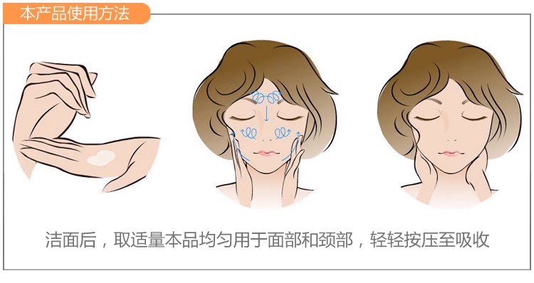 使用方法:洁肤后取适量本品均匀用于面部和颈部,轻轻按压至吸收。