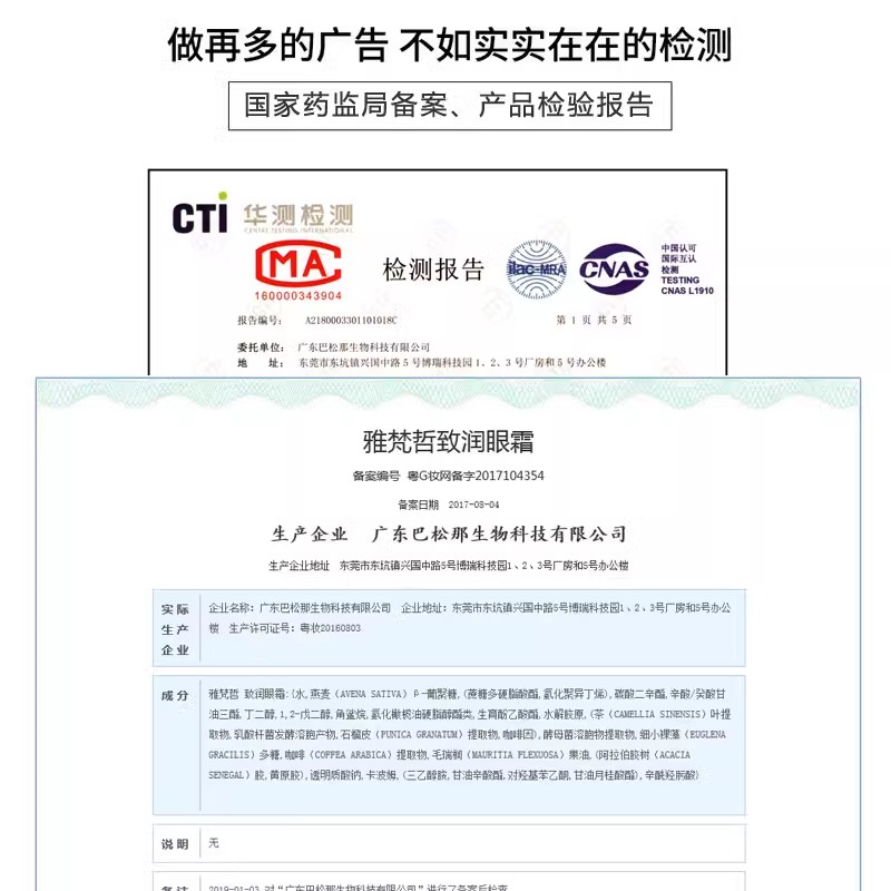 产品说明:紧实力量源源注入,赋予眼周完美细致呵护,类肉素融合植物甾醇酯,舒缓滋养的同进有交减淡细纹、皱纹,改善眼周肤色不均及眼袋状况,并强势抵御进光痕迹,令弹润、丰盈的年轻肌肤再度绽放光彩。