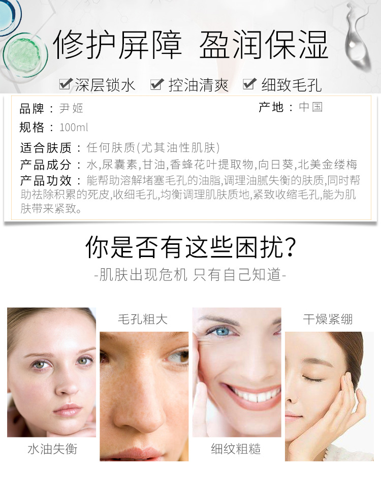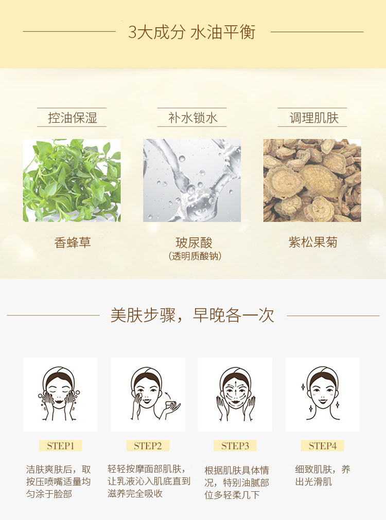 使用方法:洁肤爽肤后,取本品适量均匀涂于肌肤,轻柔打圈至吸收。