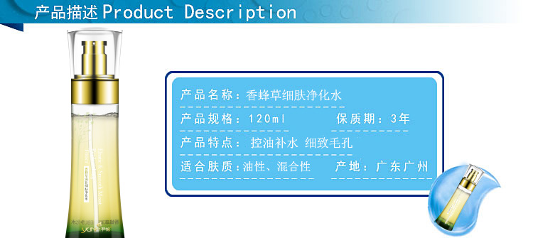 产品功效:补充水分,调理油脂分泌失衡的肤质,深入净化毛孔,调整PH值,令肌肤纹理细致光滑,促进角质层的自我更新频率,令肌肤清新自如,水嫩无油。