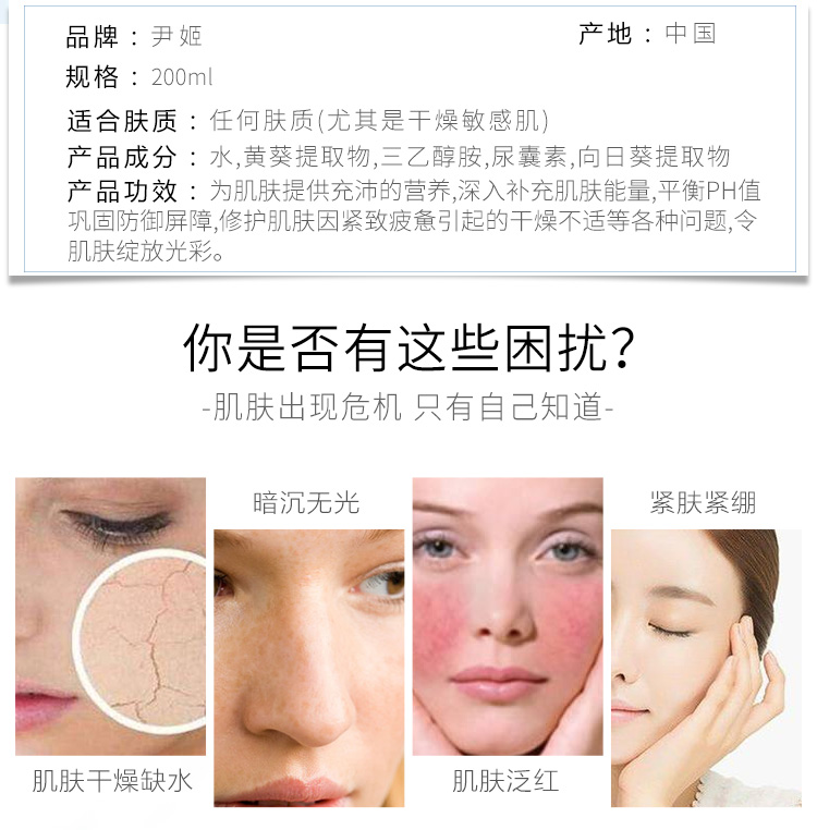 产品功效:为肌肤提供适当的养份水份,调整肌肤PH值,安抚肌肤因紧张疲惫引起的干燥不适等各种问题,令肌肤恢复光泽,舒适健康。
