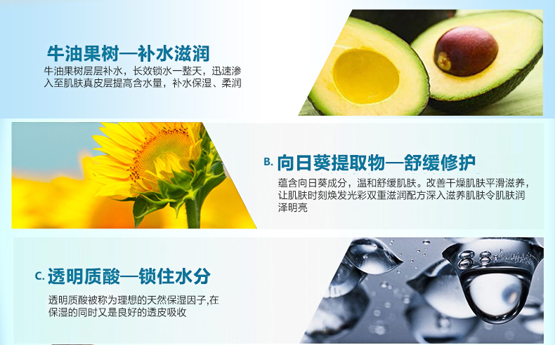 使用方法:洁肤爽肤后,取本品适量均匀涂于面部轻柔打圈至吸收。