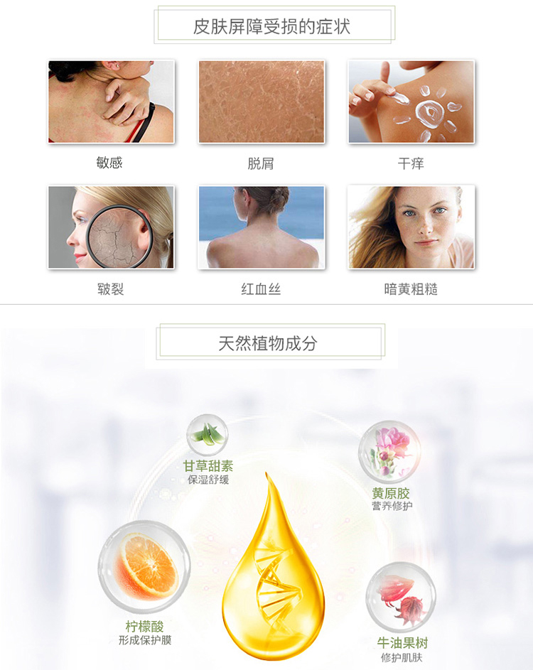 产品功效:对脆弱不适的肌肤具有良好的舒缓抚慰作用,能滋润修复脆弱肌肤,在肌肤表面形成修复保护膜,令肌肤柔嫩光洁,恢复原有光泽和活力。