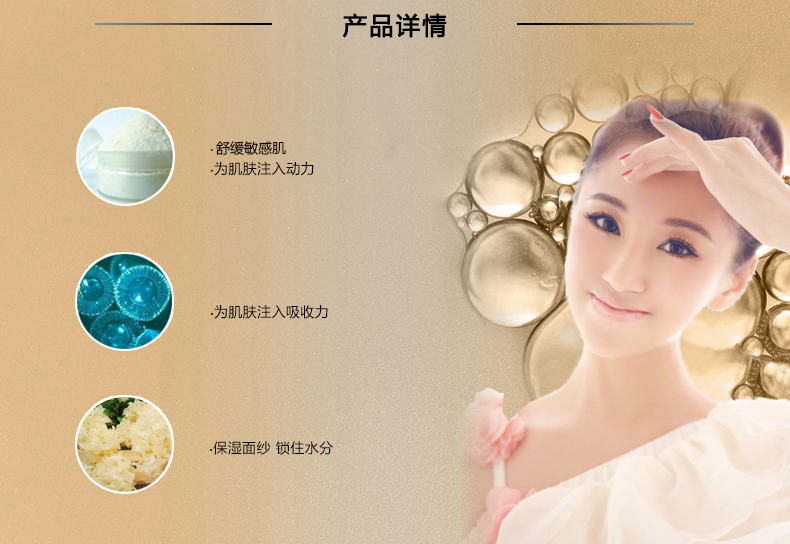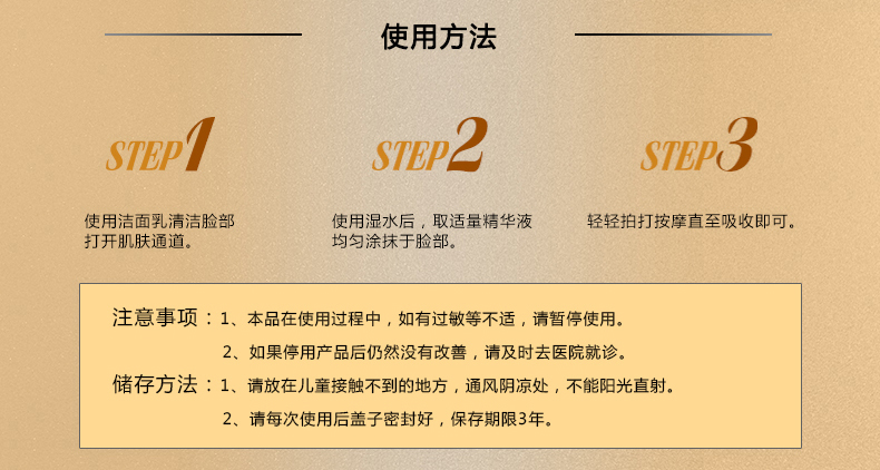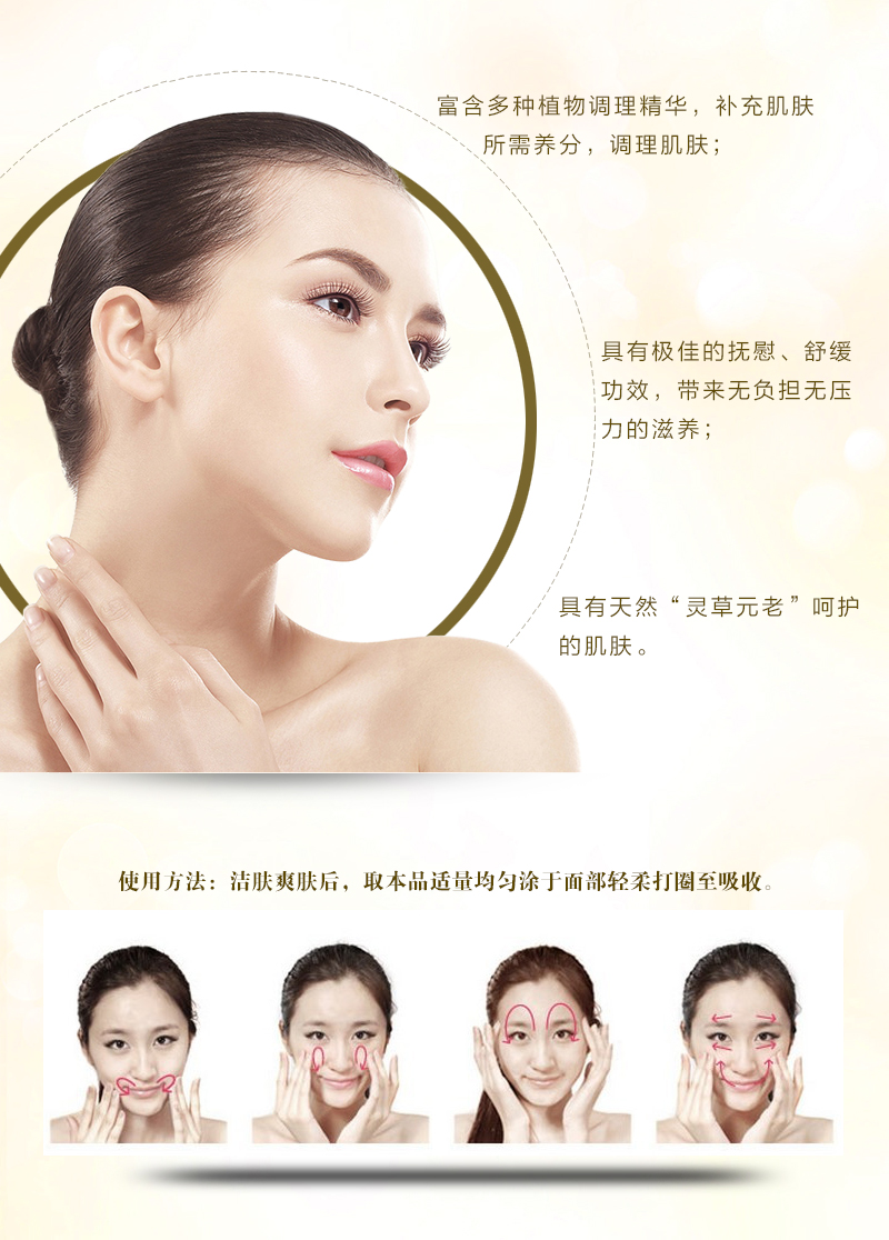 使用方法:洁肤爽肤后,取本品适量均匀涂于面部轻柔打圈至吸收。