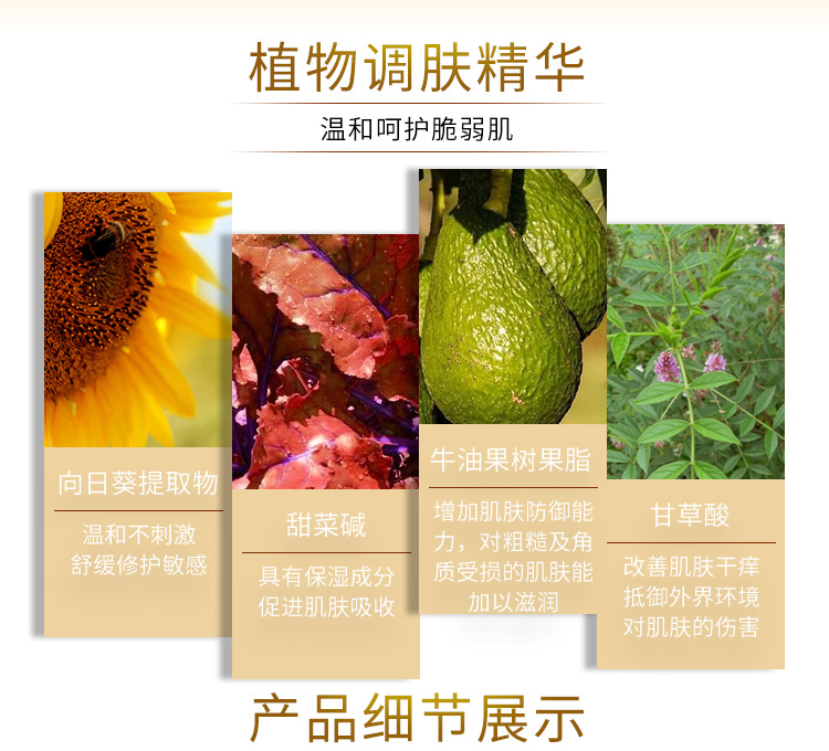 产品功效:本品含多种易于吸收的植物调肤精华,能补充肌肤所需养分,调理肌肤至正常状态,具有的抚慰、舒缓功,令肌肤恢复健康柔嫩。
