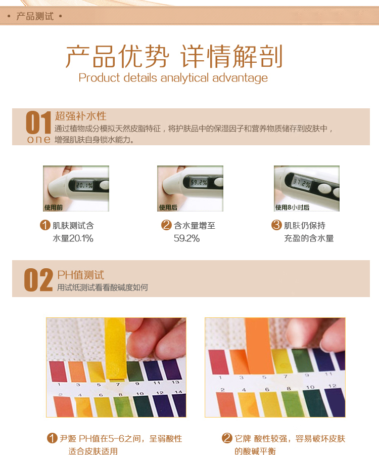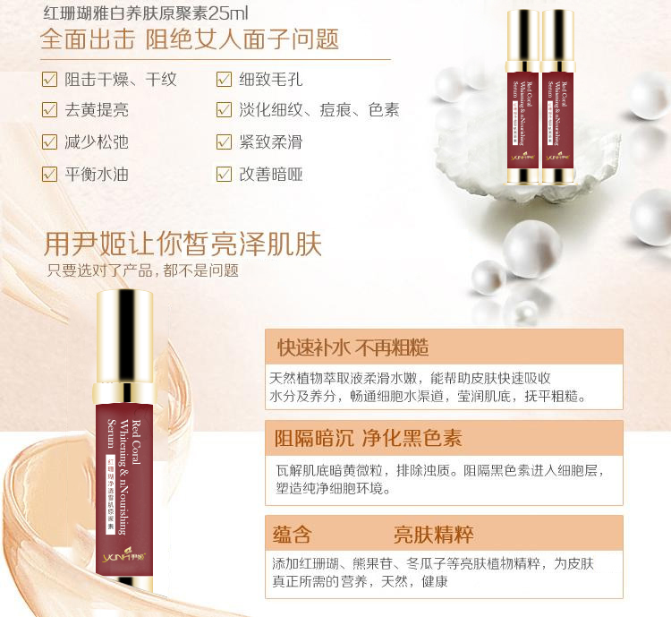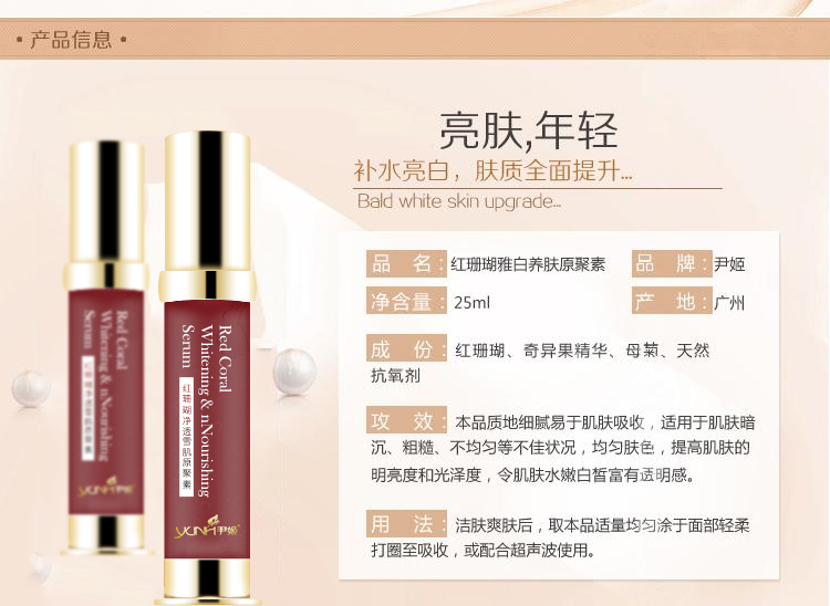 产品功效:本品质地细腻易于肌肤吸收,适用于肌肤暗沉、粗糙、不均匀等不佳状况,均匀肤色,提高肌肤的明亮度和光泽度,令肌肤水嫩白皙富有透明感。