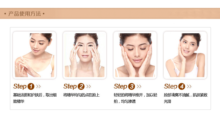 使用方法:洁肤爽肤后,取本品适量均匀涂于面部轻柔按摩至吸收。