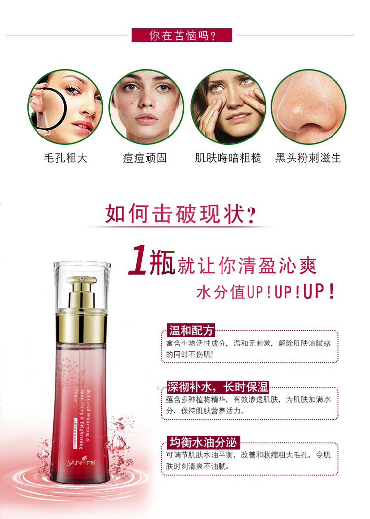 产品功效:滋润肌肤,平衡肌肤酸碱值,整理肌肤纹路,提高肌肤吸收后续保养品的能力,令肌肤水嫩富有光泽。