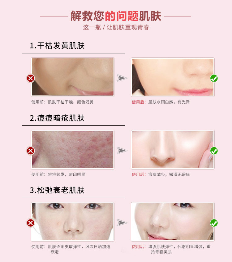 使用方法:洁肤后,取本品适量均匀涂于面部轻拍至吸收。