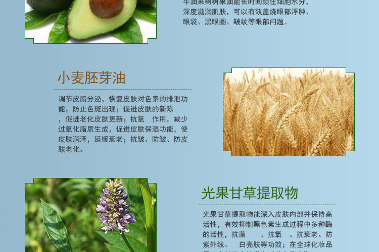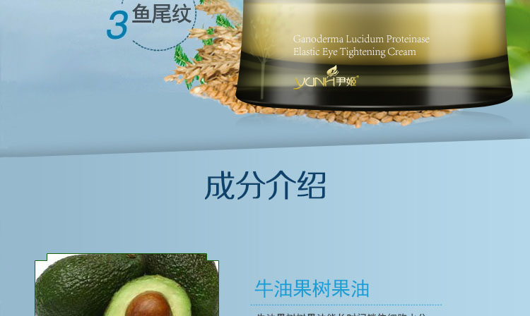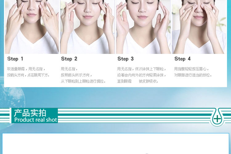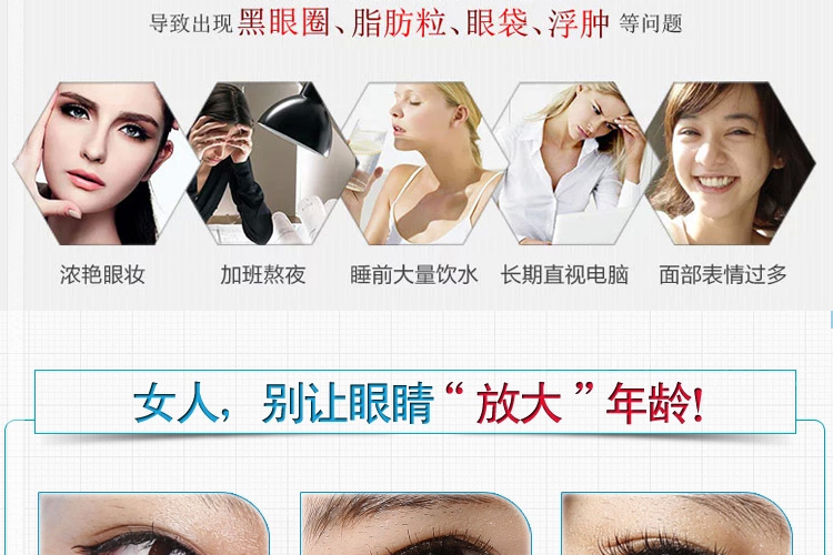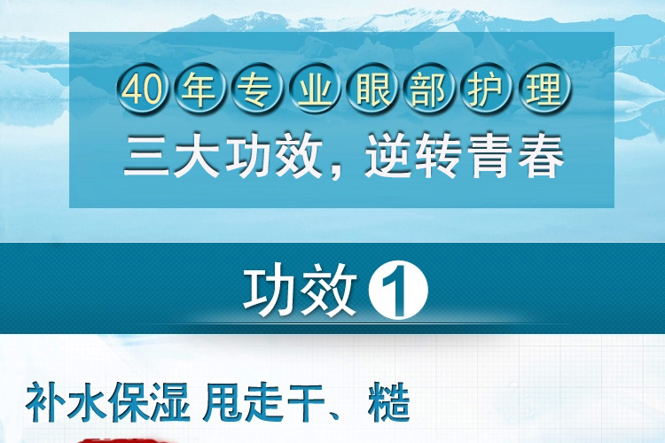 产品功效:针对松弛、细纹的眼周皮肤特点,充分补充肌肤所缺水分和养分,有提高眼部肌肤紧致度,改善松弛、提亮肤色,令双眸富有弹性,更加明亮生辉。