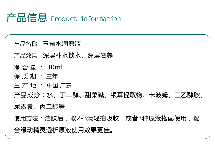 使用方法:洁肤后,取2-3滴轻拍吸收,或者3种原液搭配使用,配合绿动精灵透析原液使用果更佳。