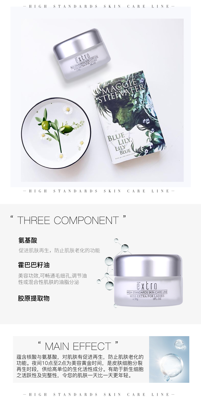 产品特点:促进肌肤代谢,减缓肌肤老化。蕴含10%的胶原蛋白,增强肌肤弹性,防止皱纹产生。分子细腻,快速渗透吸收。