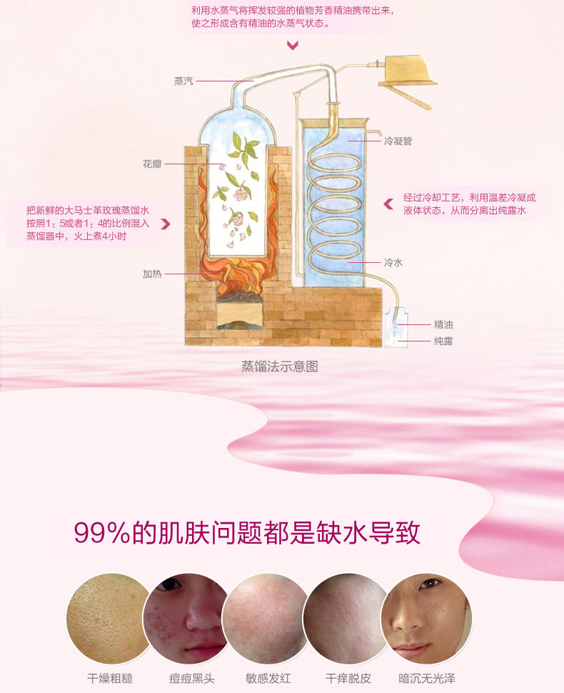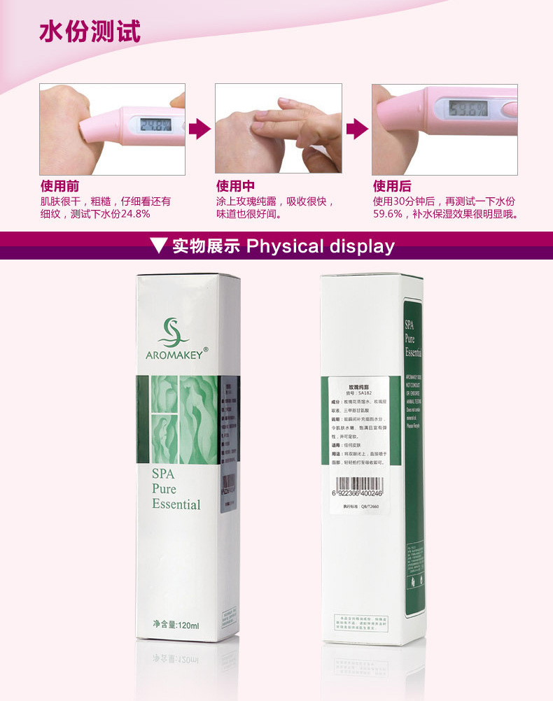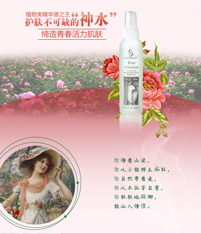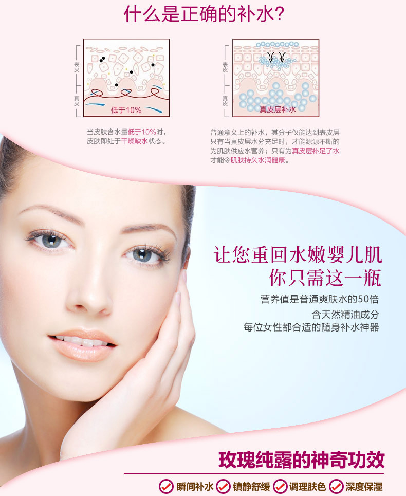 产品说明:玫瑰纯露,能瞬间补充皮肤水份,令肌肤水嫩、饱满且富有弹性,并可强定妆。