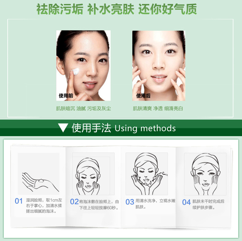 使用方法:取适量于面、颈部轻柔打圈清洗后,清水洗净。