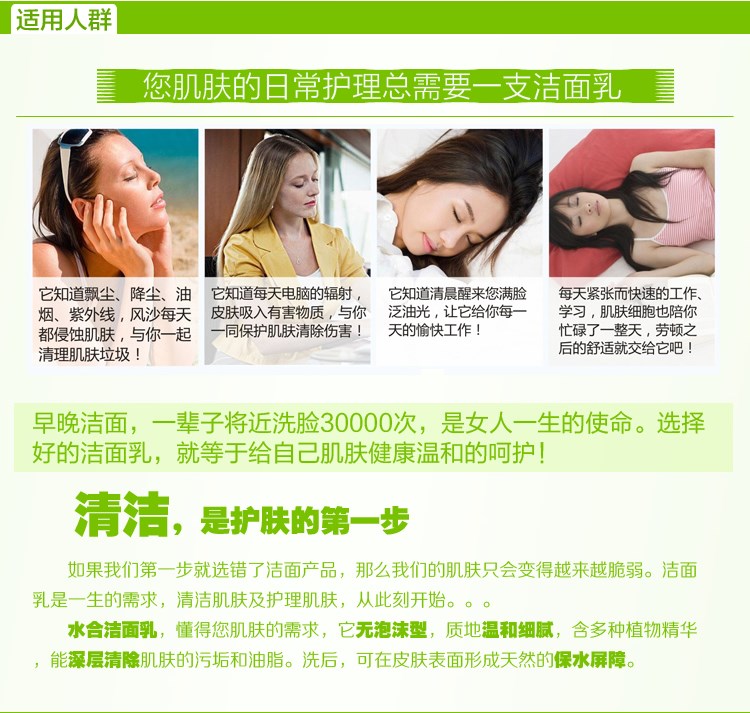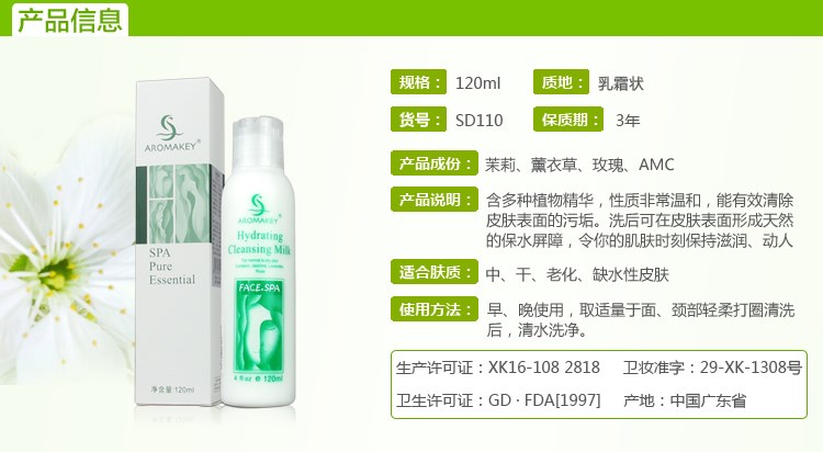 产品说明:含多种植物精华,性质非常温和,能有改善皮肤表面的污垢,洗后可在皮肤表面形成天然的保水屏障,令你的肌肤时刻保持滋润、动人的。