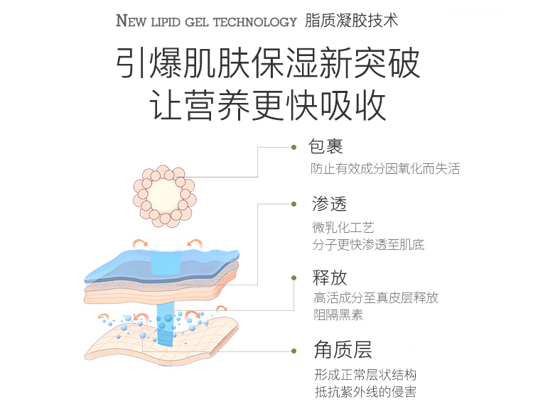 补充肌肤需要的细.胞间脂质,在肌肤表面形成层状透气的保护膜,锁住水分,使肌肤持久滋润