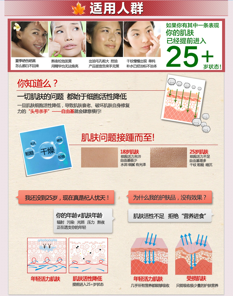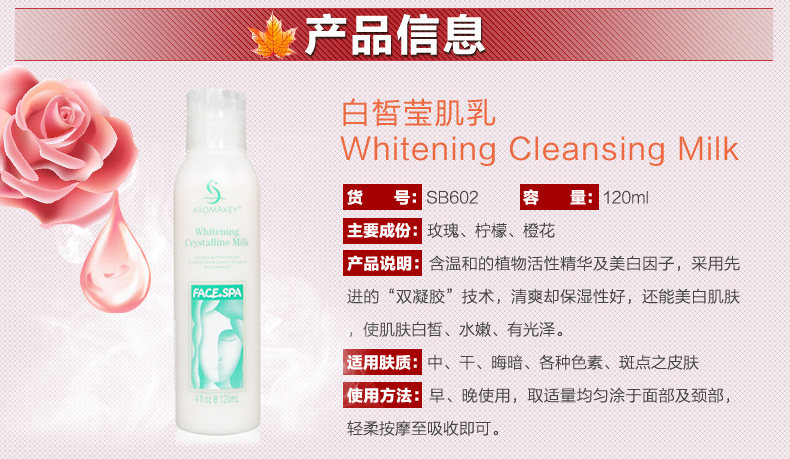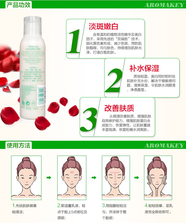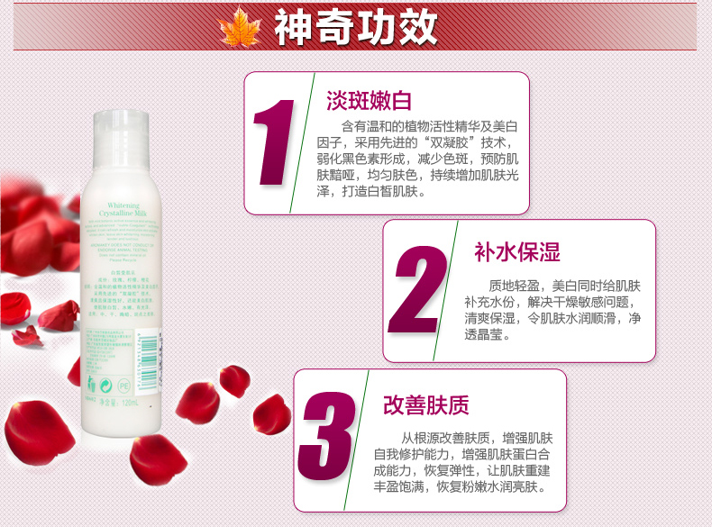 含温和的植物活性精华及亮白因子,采用先进的“双凝胶”技术,清爽却保湿性好,还能亮白肌肤,使肌肤白皙、水嫩、有光泽