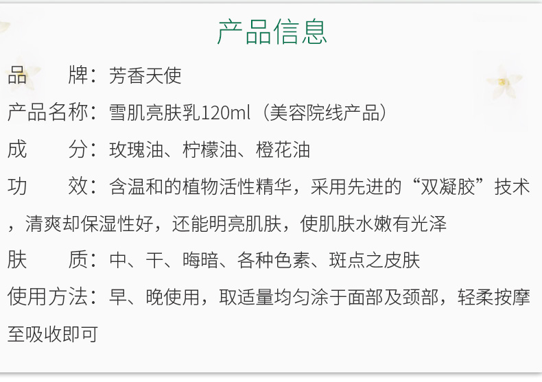 芳香天使 雪肌亮肤乳120ml 清爽保湿 水嫩肌肤亮白乳液