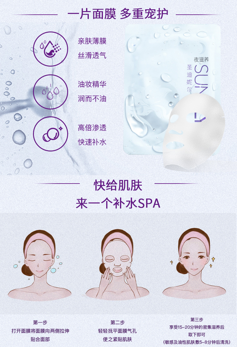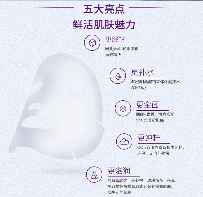 采用蚕丝亲肤薄膜,触感柔软贴肤透气,清爽舒适的精华滋养缺水肌肤,令肌肤水样畅享,沁润盈透(取出面膜,敷于面部,轻轻调整至膜布贴合肌肤,敷15-20分钟,取下面膜,用指腹轻轻按摩,帮助精华吸收)