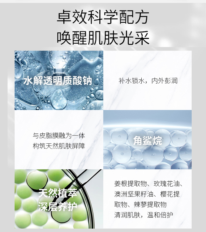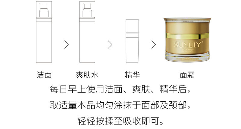 含多肽胶原蛋白,能快速渗透肌肤,加强肌肤的锁水能力,使水分不流失,让肌肤持久滋润,改善肌肤细纹等现象,保持肌肤光滑和弹性。(每天早间使用精华液后,取适量产品均匀涂于全脸至吸收)