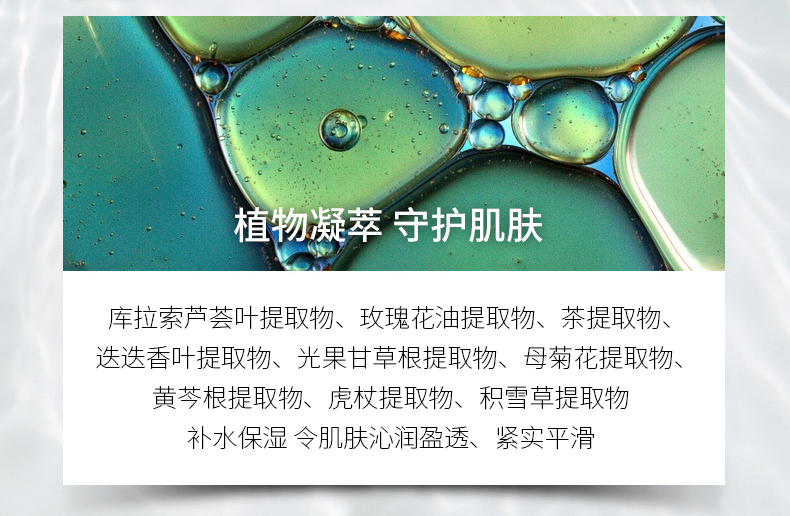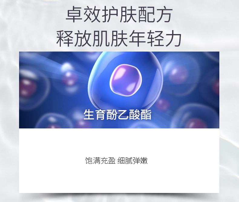 深层滋养、强化肌肤弹力,紧致皮肤,给予肌肤滋润与健康弹性,使干涩肌肤快速恢复光泽。(每天早晚洁肤后,取适量产品均匀涂于全脸至吸收)