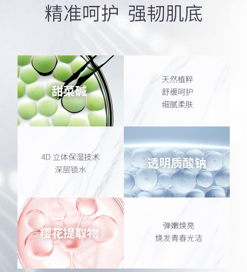 含多肽胶原蛋白精华,能快速渗透肌肤,让肌肤持久滋润,补充胶原蛋白,弹力纤维和透明质酸,提高肌肤的含水量,加强皮肤的弹性,呈现青春光滑的容颜。(每天早晚用完爽肤水后,取适量产品均匀涂于全脸至吸收)