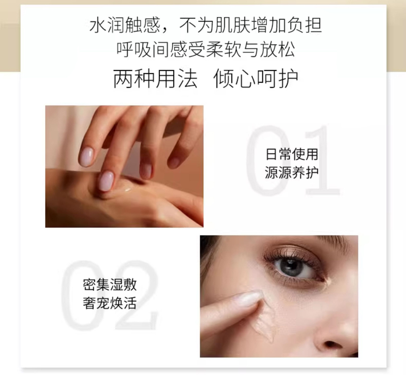 锁水,有效提高肌肤活力,增加肌肤紧实度,减缓细坟,使肌肤水嫩、年轻富有弹性