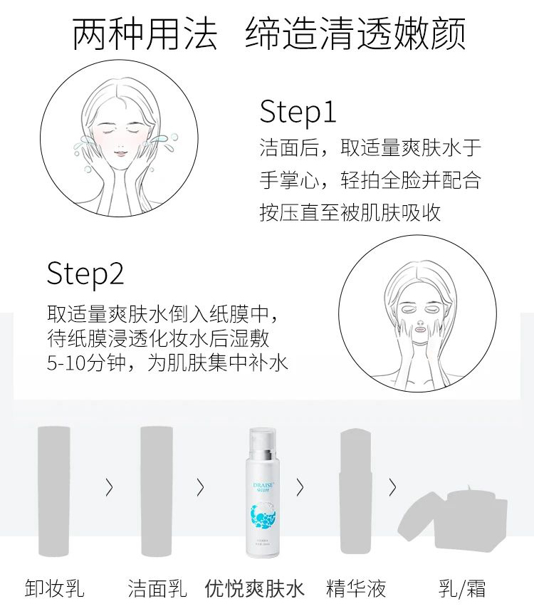 1.洁面后,取适量爽肤水于手掌心,轻拍全脸并配合按压直至被肌肤吸收。2.取适量爽肤水倒入纸膜中,