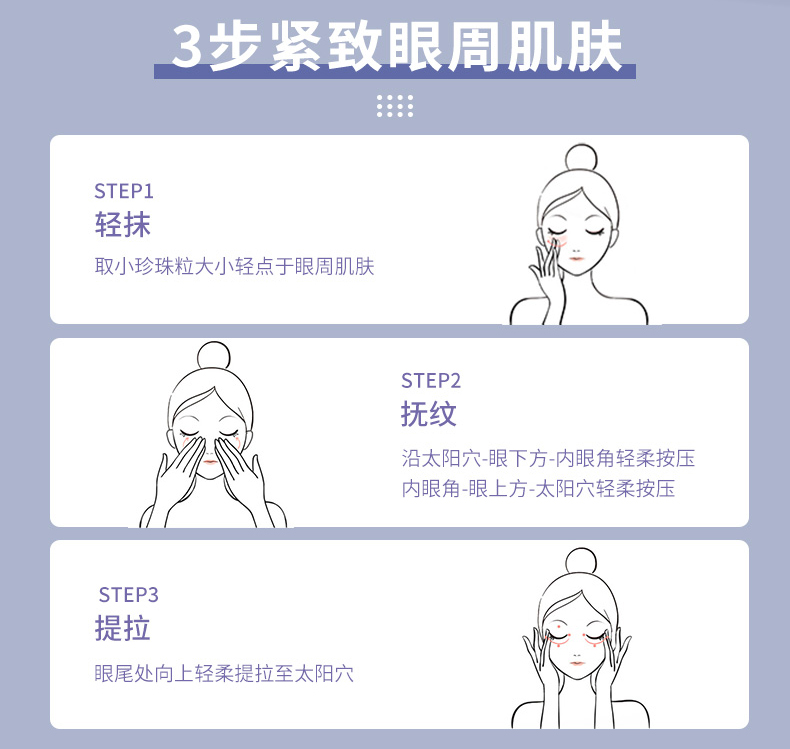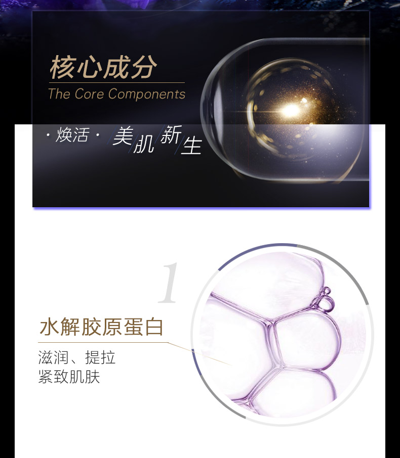 补充胶原纤维,淡化眼周肌肤皱纹、干纹,促进眼周血液循环,改善浮肿,收敛肌肤,提升下垂的眼角,使眼部肌肤平滑紧致、柔润。 蕴含红酒中抗衰元素白藜芦醇,修护眼周受损微循环血管,促进眼周血液循环,能有减淡黑眼圈、浮肿及难缠细纹,并持久紧致眼部肌肤不长皱纹