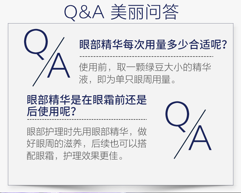 全新紧致精华,使用柔韧弹性技术,促进胶原蛋白增生,加强肌肤弹性,立体提拉肌肤,长期使用可令眼周肌肤柔滑细腻,预防眼部皱纹及细纹的产生,绽现紧实眼眸,平抚岁月痕迹。 直接补充胶原蛋白,帮助肌肤产生全新的胶原蛋白,保持皮肤的吸水性和保湿性。改善静态纹,达到肌肤紧实目的,与其它保湿成分互配,可以加速眼周皮肤紧致拉提之