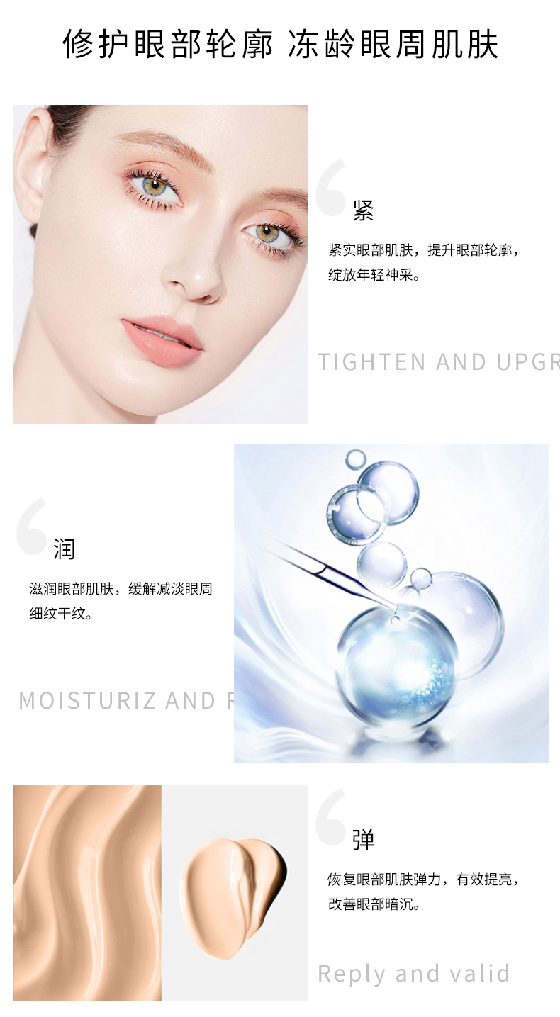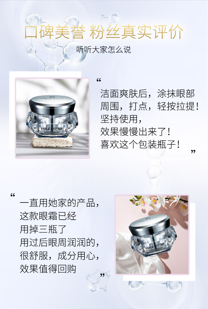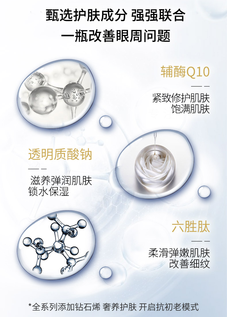 钻石烯复配酵母精华、辅酶Q10,可焕亮眼周、改善眼周皱纹,让眼周肌肤感受丰润滋养,尽显柔滑紧密,双眸焕发年轻(尤其适合松弛,无弹性,有细纹的肌肤)