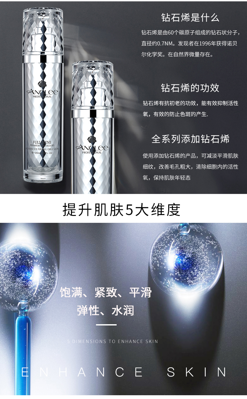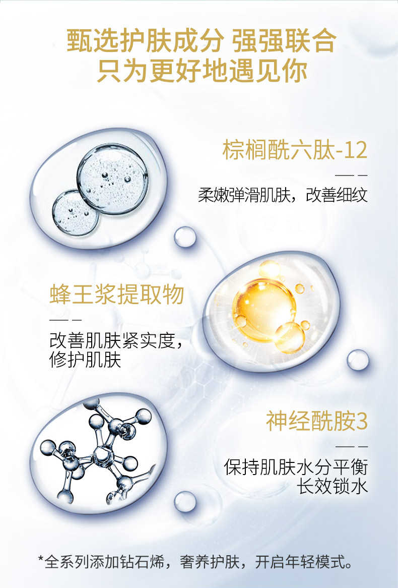 水润乳液帮您锁住水分、滋润肌肤,使肌肤弹润、丰盈、光滑。蕴含专/利成分钻石烯及胜肽成分,能改善肌肤松弛、细纹等现象,焕发肌肤充盈饱满的青春靓丽(尤其适合松弛,无弹性,有细纹的肌肤)