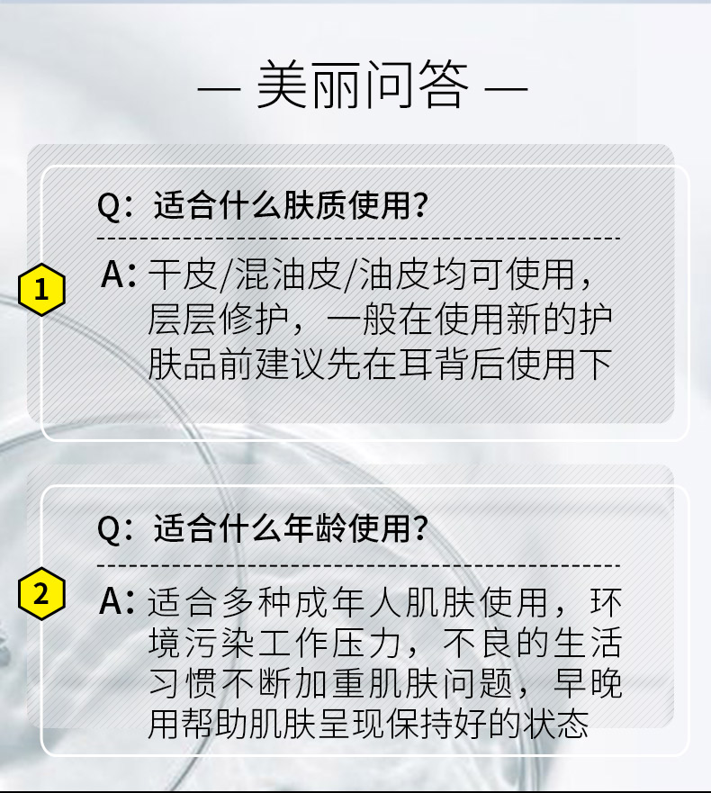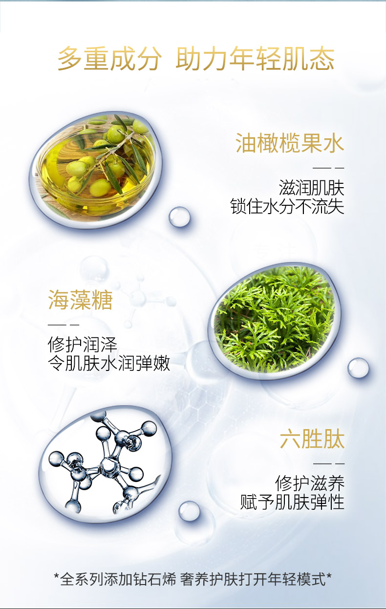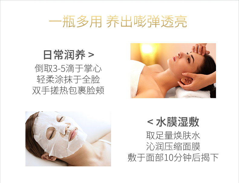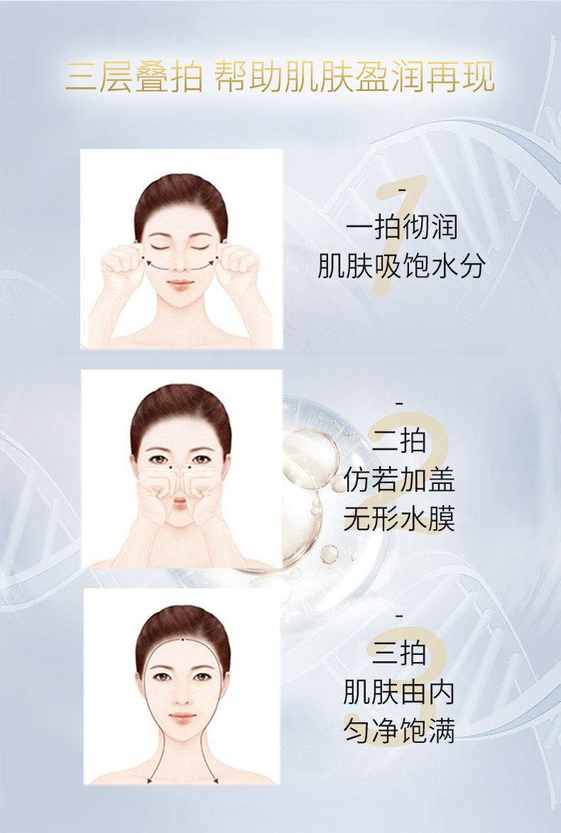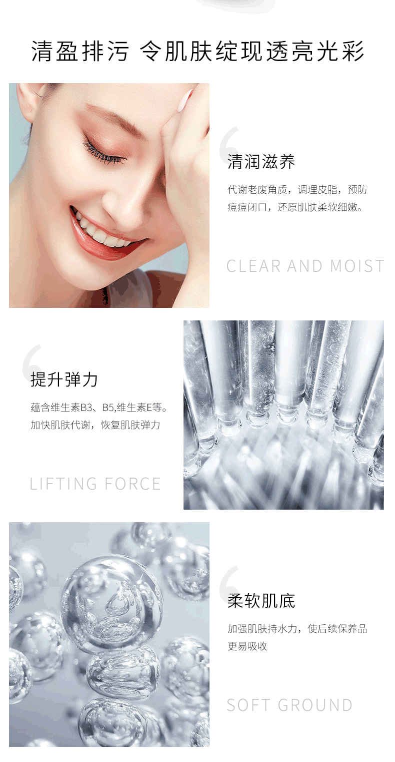 带给肌肤舒适的保湿效果,为皮肤吸收后续护肤品的成分做好准备。赋予肌肤水分,营造保湿环境,打造水润柔嫩的丝滑肌肤