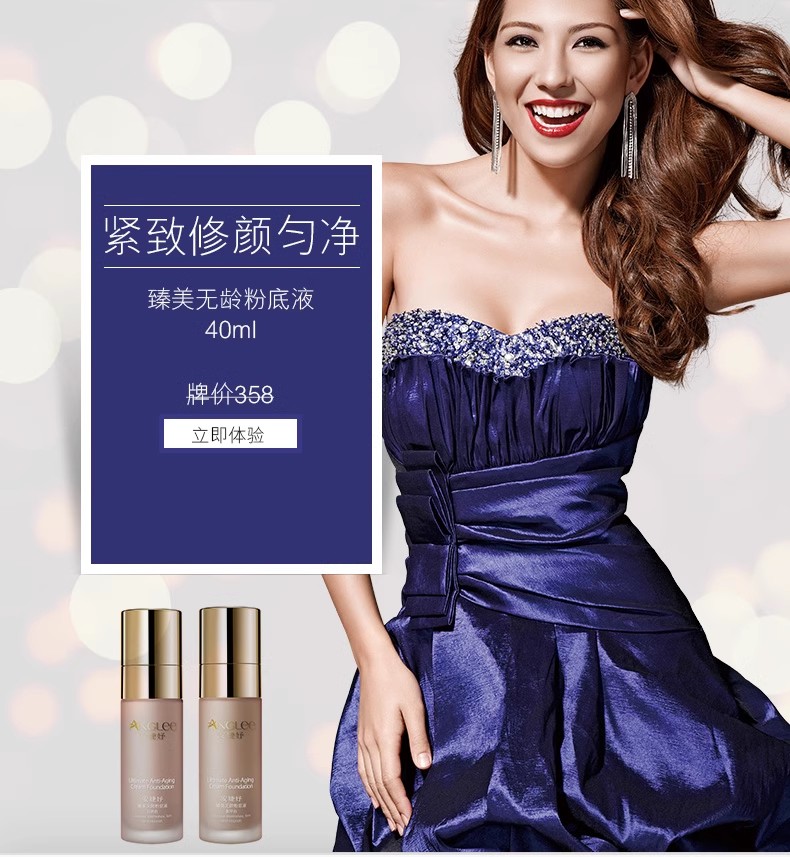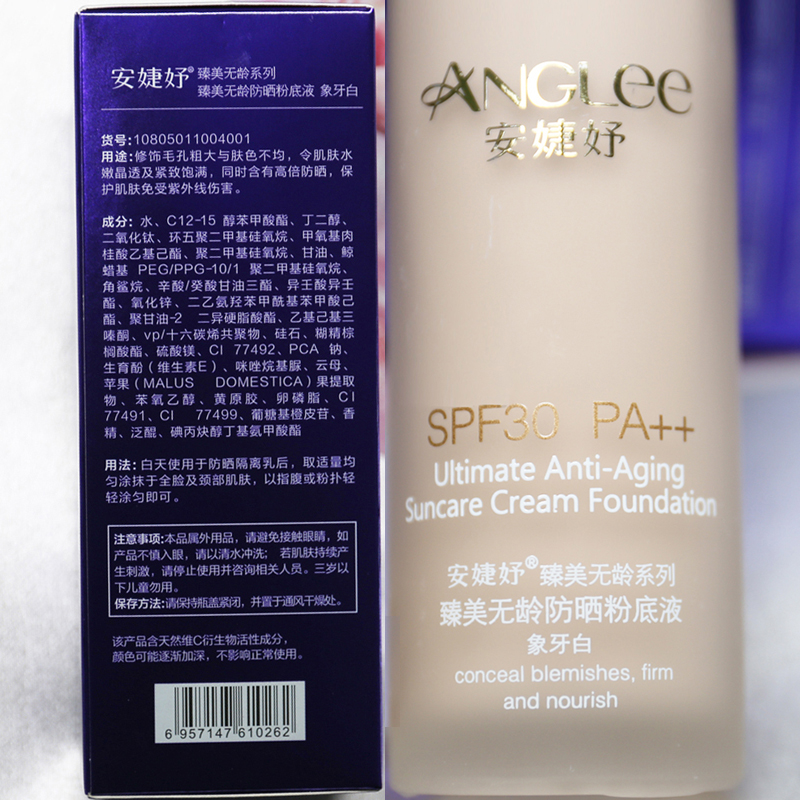 安婕妤 臻美无龄防晒粉底液40ml(象牙白)SPF30PA++ 产品功效:修饰毛孔粗大与肤色不均,兼具遮瑕、养肤、提拉等多效功能,令肌肤水嫩晶透、紧致饱满。一瓶兼具遮瑕、定妆、养肤、提拉多效功能,粉底液强化保湿效果,让肌肤白嫩,是一瓶多效多能的“微雕”粉底液。 适合肤质:适合有细纹干纹的初老肌肤 使用方法:日间于使用润肤霜后,取适量均匀涂抹全脸 轻拍至肤色均匀服帖。