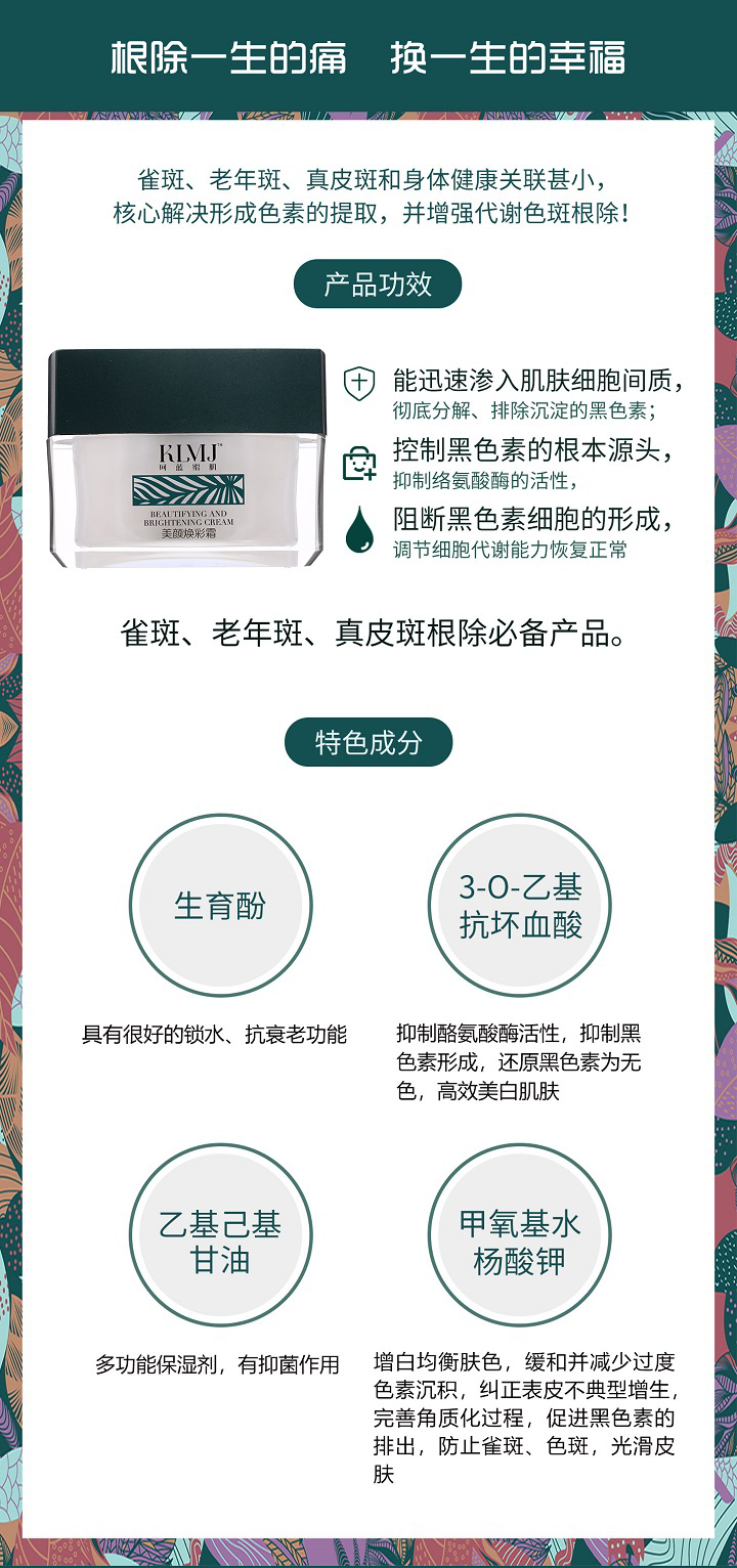 瓦解沉淀的黑色素,减少黑色素的根本源头,减少黑色素肌底的形成,调节肌底的代谢能力恢复正常,******、*********、真皮斑淡化的产品。
