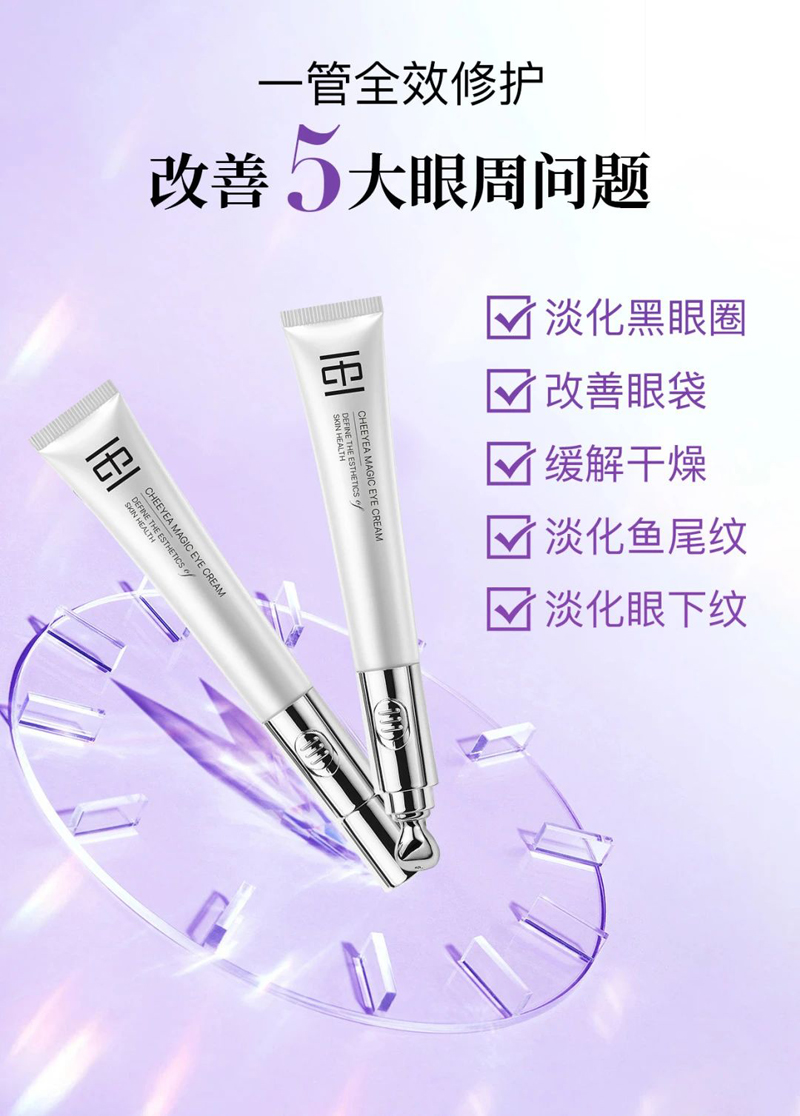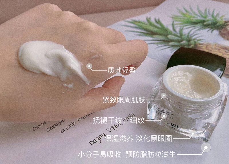 细腻的霜体质感,舒润柔滑,淡化细纹皱纹,去除黑眼圈,眼部赋活焕新,绽现年轻光采(定向抚纹,逆龄新生,深层补水-滋养眼周肌肤。击褪暗沉-告别眼圈眼袋。水嫩双眸-保持年轻状态)